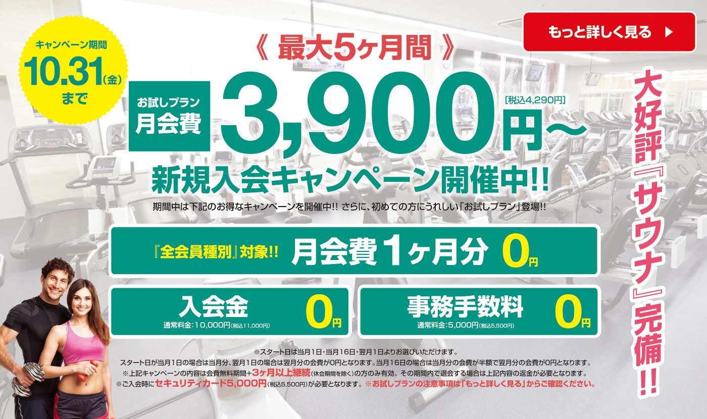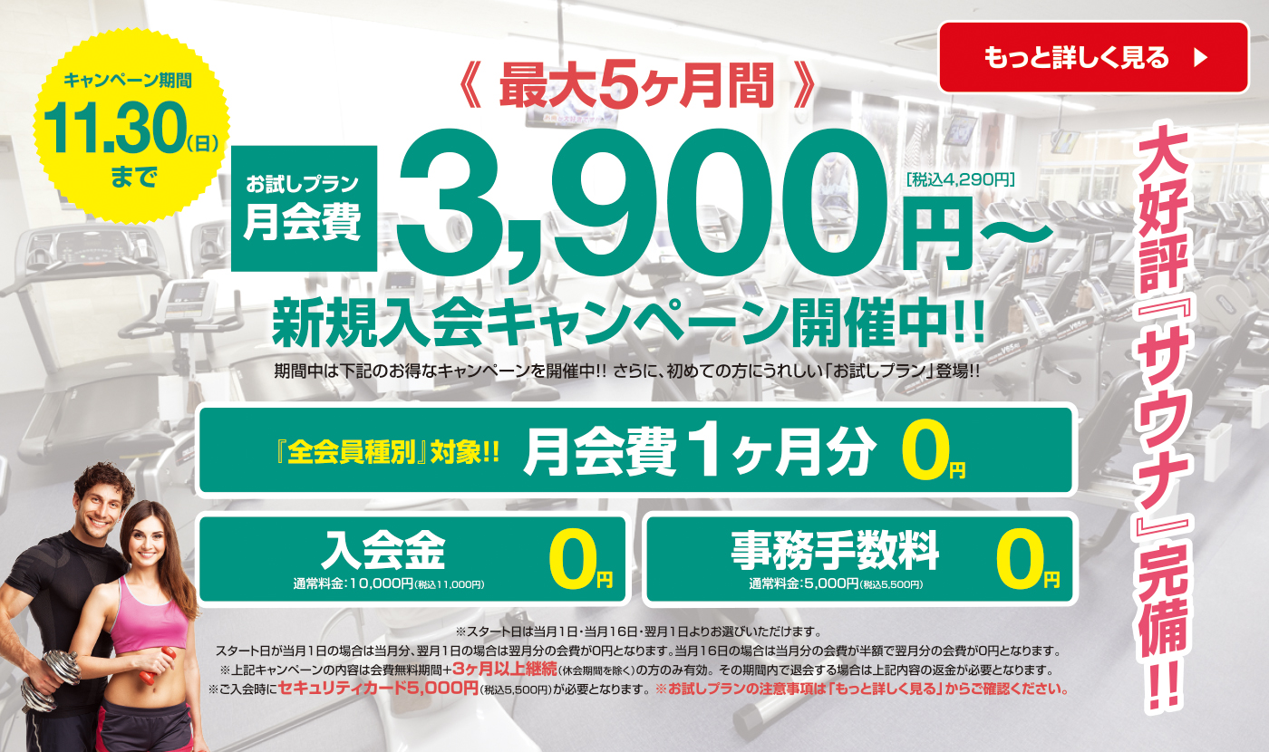 【月会費3900円〜】3店舗のジムエリアとサウナと24時間ジムが使い放題。お試しキャンペーン開催中!