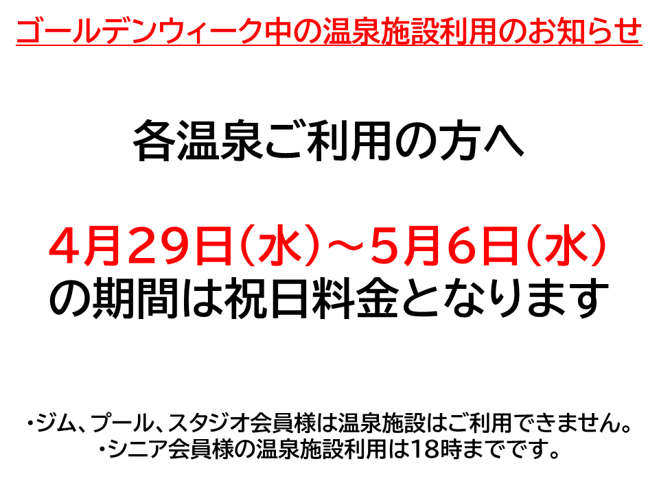 インフォメーション 2026.04.28 お知らせ ゴールデンウィーク中の温泉施設利用のお知らせ 前の記事へ 記事一覧へ戻る NEWS 【2019年12月14日】年末年始の休館日のご案内 【2026年04月28日】ゴールデンウィーク中の温泉施設利用のお知らせ 【2026年02月01日】プール修理完了のお知らせ 【2026年01月28日】プール修理日程お知らせ 【2026年01月23日】プール昇温ポンプ故障のお知らせ 【2025年12月08日】年末年始の休館のお知らせ 一覧を見る SOCIAL INFORMATIONフォローしてお得な情報をゲットしよう。 マチカラフィットネス大分