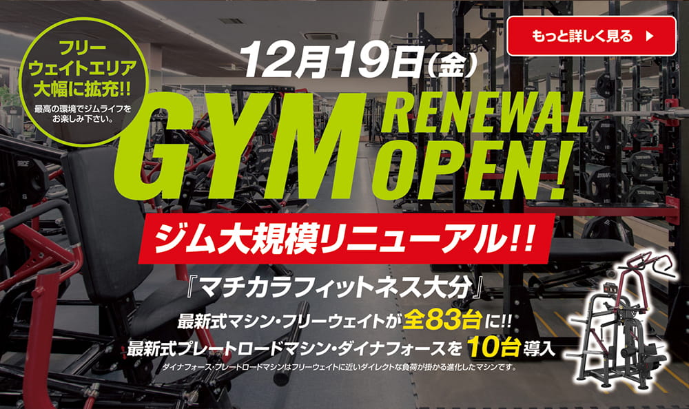 MUCHCOLOR' TOPICS 新規「お試し」入会キャンペーン開催中! 施設を詳しくみる 施設を詳しくみる 施設を詳しくみる NEWS 【2019年12月14日】年末年始の休館日のご案内 【2026年02月01日】プール修理完了のお知らせ 【2026年01月28日】プール修理日程お知らせ 【2026年01月23日】プール昇温ポンプ故障のお知らせ 【2025年12月08日】年末年始の休館のお知らせ 【2025年12月08日】敷戸店、レンブラント店の年末年始の各種受付休止のご案内 一覧を見る SOCIAL INFORMATIONフォローしてお得な情報をゲットしよう。 マチカラフィットネス大分
